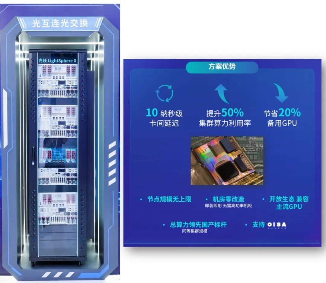凭借节点规模无上限、不受协议限制、可突破核心器件和供应链瓶颈的独特价值,其实现了10纳秒级卡间延迟,带来集群算力利用率提升50%的飞跃,同时节省20%的备用GPU资源,为超大规模智算集群建设提供了全新选择。