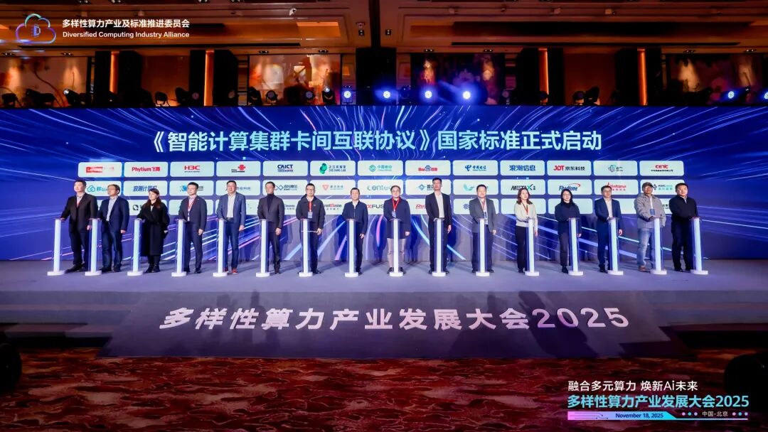 11月18日,以“融合多元算力 焕新AI未来”为主题的多样性算力产业发展大会2025在北京成功举办。曦智科技联合创始人兼CTO孟怀宇博士受邀出席,并作为核心参编单位代表参与《智能计算集群卡间互联协议》国家标准启动仪式。