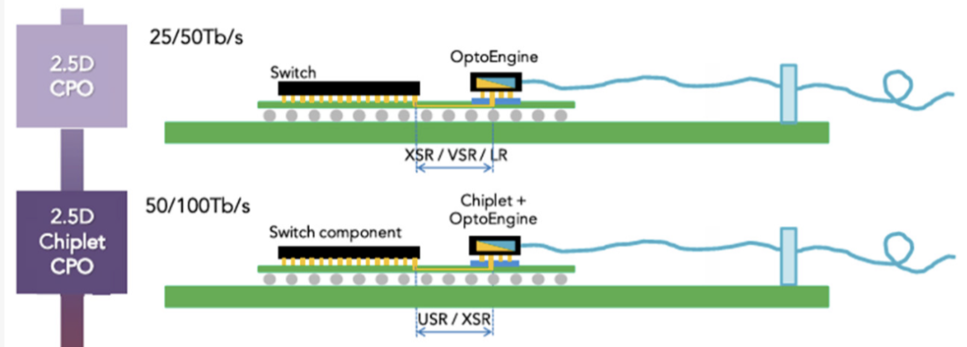 如图所示,NPO架构将光引擎与封装ASIC相邻布局于光学基板上,二者通过高性能基板互连。根据OIF标准,NPO中ASIC与光学元件的间距可达150mm,同时确保信道损耗≤13dB。