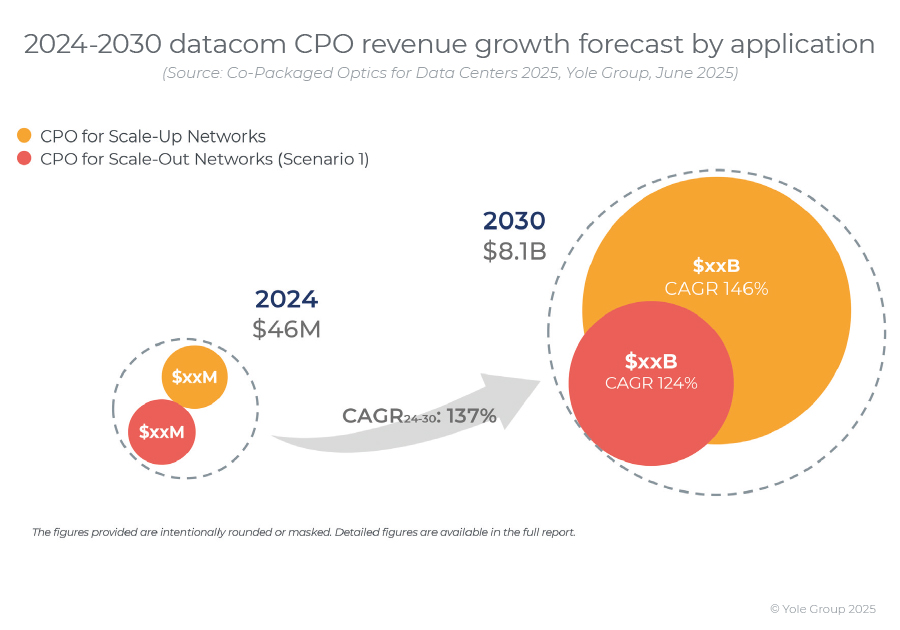 知名分析机构Yole也预测,为了解决数据中心面临的功率、密度、可扩展性、带宽和距离限制等问题,产业界正在推动从铜缆到光纤,从可插拔光模块到CPO的转变,这将带动CPO市场规模从2024年的4600万美元跃升到2030年的81亿美元,复合年增长率达137%。有见及此,除了文章开头提到的几家厂商以外,包括台积电、格罗方德等在内的传统巨头和不少初创企业也投入到了这个轰轰烈烈的CPO浪潮中。